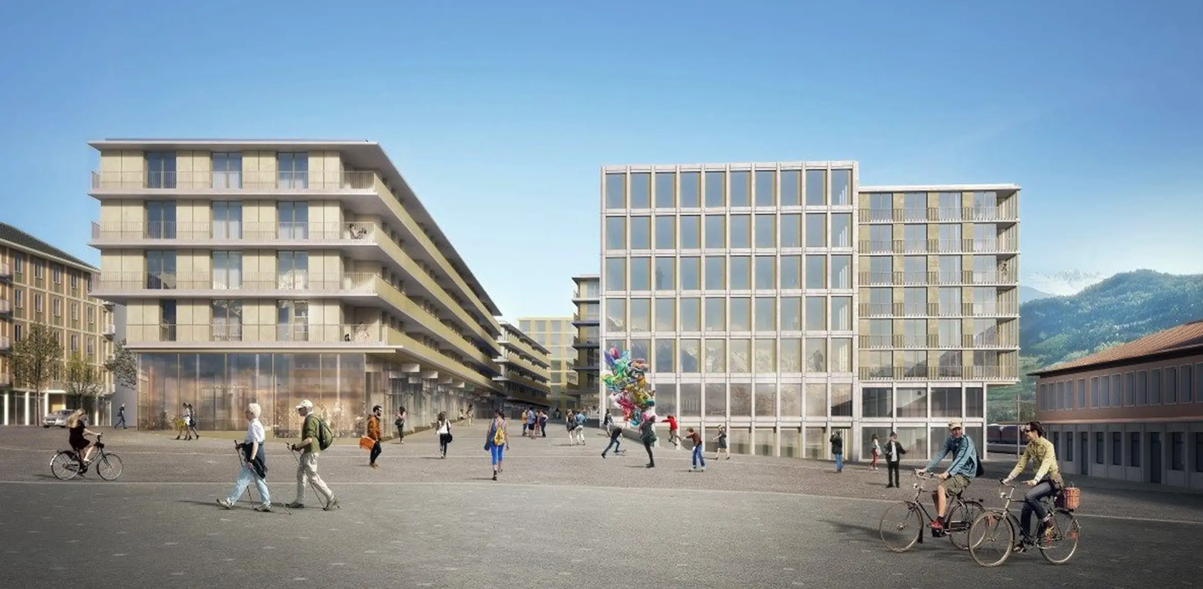 Near Sion railway station, a new family-friendly neighbourhood was planned in the heart of the city, offering in addition to residential units: office and retail spaces, a hotel and a concert hall. Positioned as the new heart of Sion, the district serves as a link between the historic old town and the current city centre, requiring a sensitive integration into the city’s existing urban dynamics.